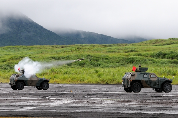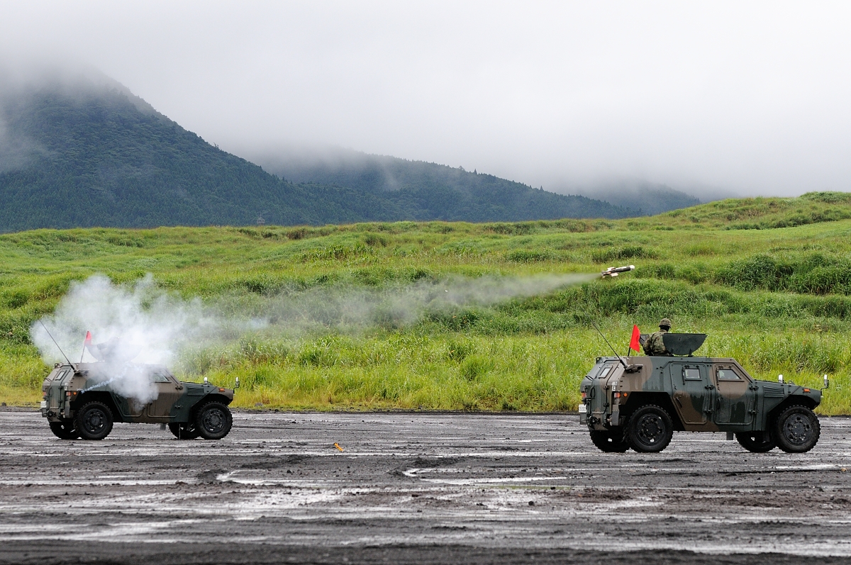 軽装甲機動車が、入場して来てロケット弾を、発射しました。ロケット弾は、多分、01式軽対戦車誘導弾