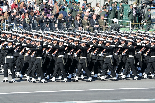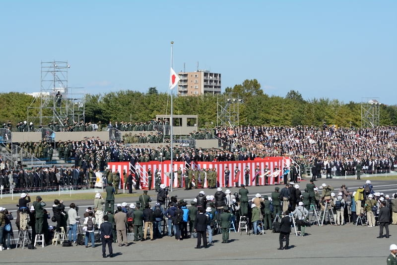 ただ、整列した隊員は全て総理の方向を見るので、「おしり」が見える事になります。逆光よりは、順光を選びました。