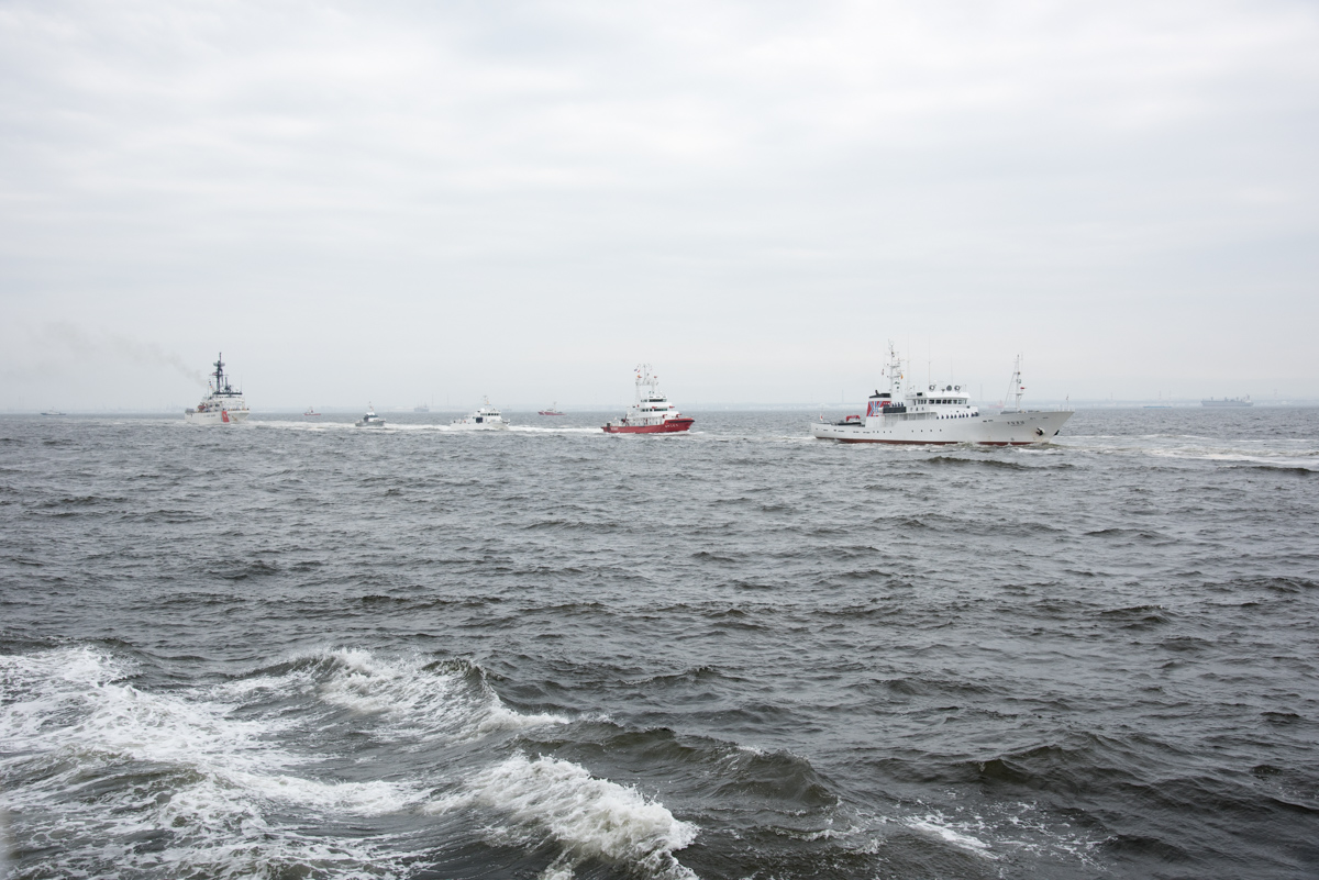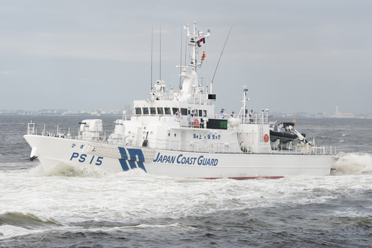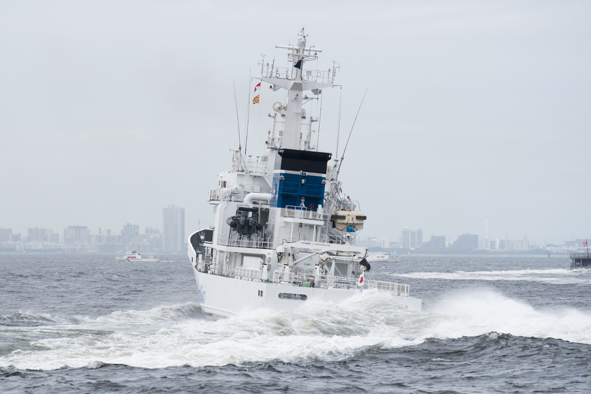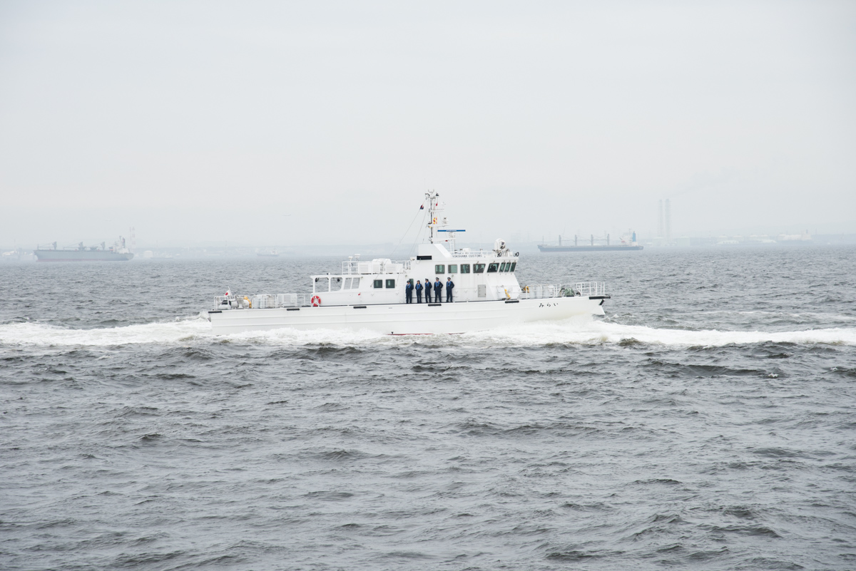 途中で横浜から出港した巡視船「いず」が加わり、合計4隻の観閲船隊が1列に並んで航行します。