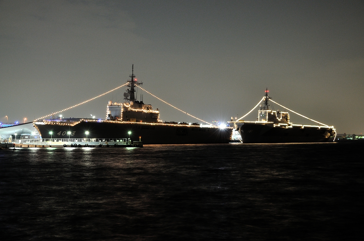 夕食後、せっかくなので、夜の電飾の行われている護衛艦を、撮影しに出かけました。