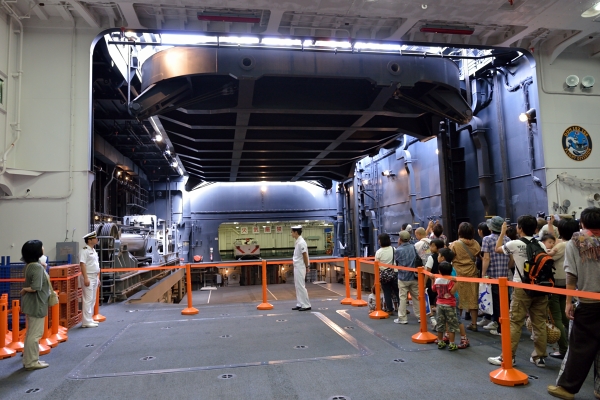 エレベーターで甲板に上がりながら、格納庫の全景を撮影しました。